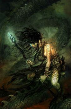 | «Baba Jaga è un personaggio della mitologia slava. Nei racconti russi impersona una vecchia strega che si sposta volando su un mortaio, utilizzando il pestello come timone e che cancella i sentieri nei boschi con una scopa di betulla d'argento. Vive in una capanna che poggia su due zampe di gallina, servita dai suoi servi invisibili. Il buco della serratura è costituito da una bocca riempita di denti taglienti e le mura esterne sono di ossa umane.» |
